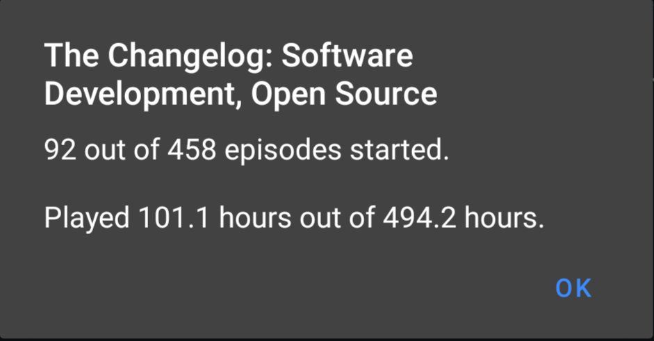 After just over 4 months, I have finished listening to every episode of @changelog from February 2021 to January 2019, and I can say, it was absolutely worth it. (There's another ~20 hours on @Podverse before I switched to @antennapod)