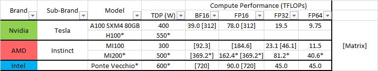 Updated compute performance for MI200: Both MI200 and PVC are fairly competitive, though timeframes for PVC are TBD, and performance of H100 has yet to be leaked. Winners: FP64 - PVC FP32 - MI200 FP16 - MI200 FP16 Matrix - PVC BF16 Matrix - PVC