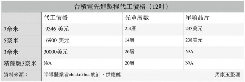 I've just found this, and N3 pricing hurts, a lot. It's ~1.8x increase in cost per wafer. N7 -> N5 was quite similar too. N7 - 9346 (2-4 EUV) [Is this N7+?] N5 - 16900 (14 EUV) N3 - 30000 (26 EUV)