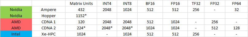 Can anyone who happens to know Compute GPUs know if my below numbers for matrix operations/cycle are right for Ampere? Also would be nice if anyone knew the INT4 and INT8 matrix ops/cycle for Aldeberan.