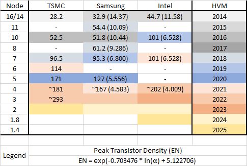 Update to Process Node Table and Graph: Primary updates are Intel's node rename, roadmaps, and Intel 4 being changed from 202-237 to 202 MTr/mm². I've also updated the formula for effective node. It turns out I used 58.5 MTr/mm² for N10 instead of 52.5.