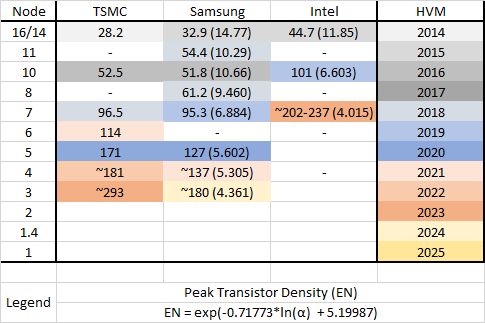 Decided to collate all the leading-edge process nodes (No Global Foundries although I have the stats, sorry) Density isn't the only factor, yes, but it's quite important. Colouring shows year that High Volume Manufacturing started. Note: SS 3GAE could be 2023 and density is TBD