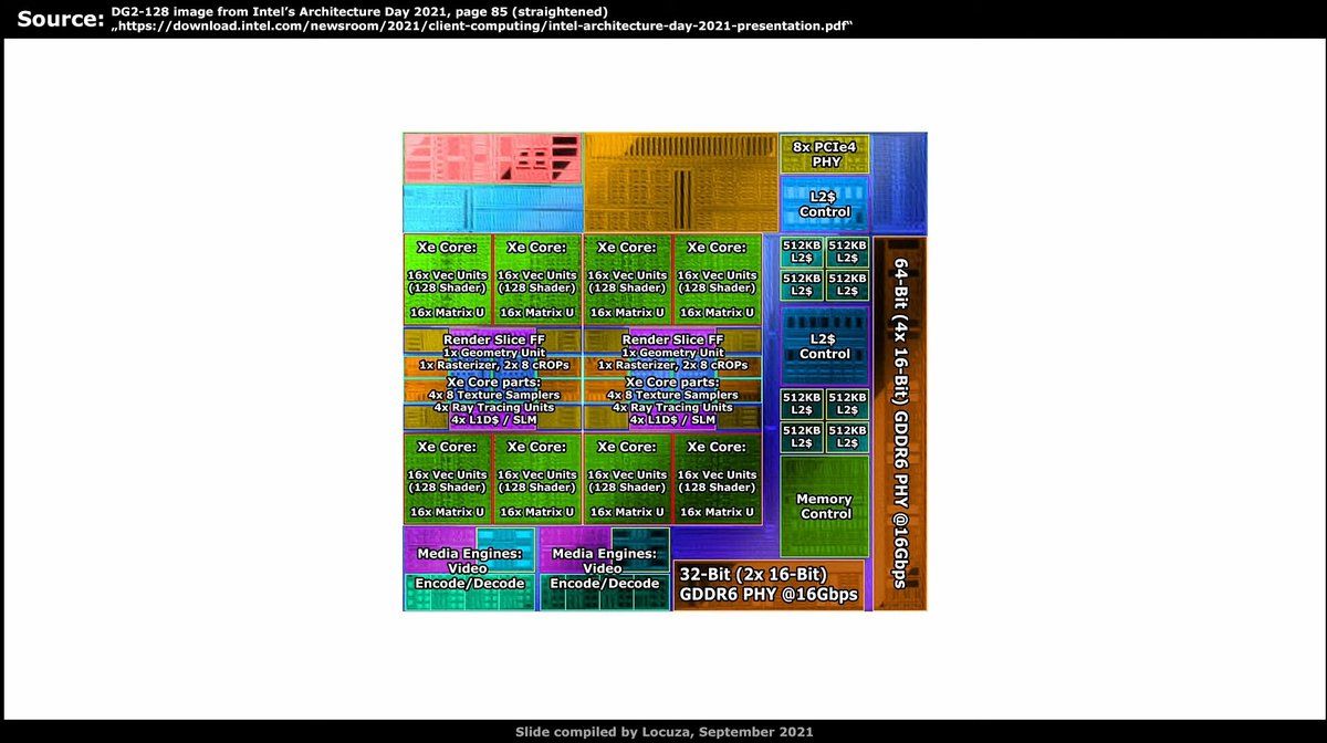 Intel Arc Alchemist SoC1 and SoC2 die graphic annotations/theorycrafting: SoC1 relative to SoC2 Scaling L2 Cache: 1:1 Scaling Memory Bus: 2.67× instead of 4× Media Engine: 1× instead of 4× PCIe: 2× @Locuza_/1464913499130368007