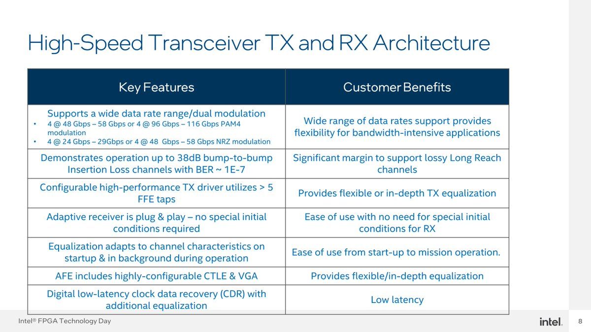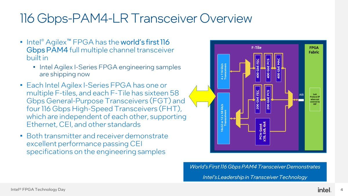 Agilex 116G Transceivers (F-Tile) Agilex-I ES Shipments Transceivers: 16× (12?) 58G, 4× 116G Spec: CEI 106.25G, 112G, 116G
