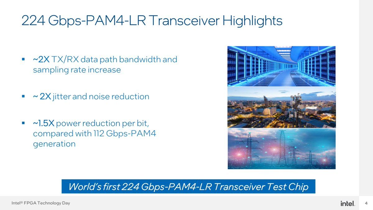 Next-generation 224G Transceiver Test Chip: 4 Links @ 56 GHz (PAM4-LR) Efficiency: -33% energy per bit Jitter/Noise: -50% Targets: 800G/1600G, OTN/OTU I assume this will be on P1277. (Intel 4 is P1276)