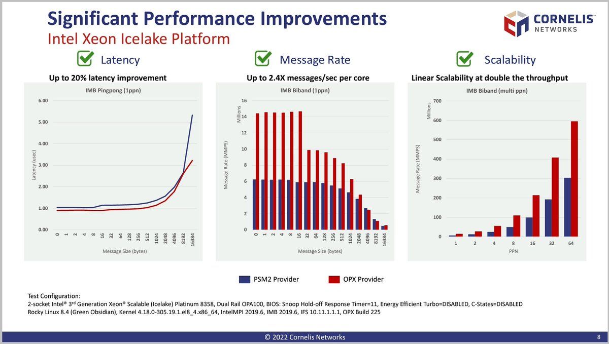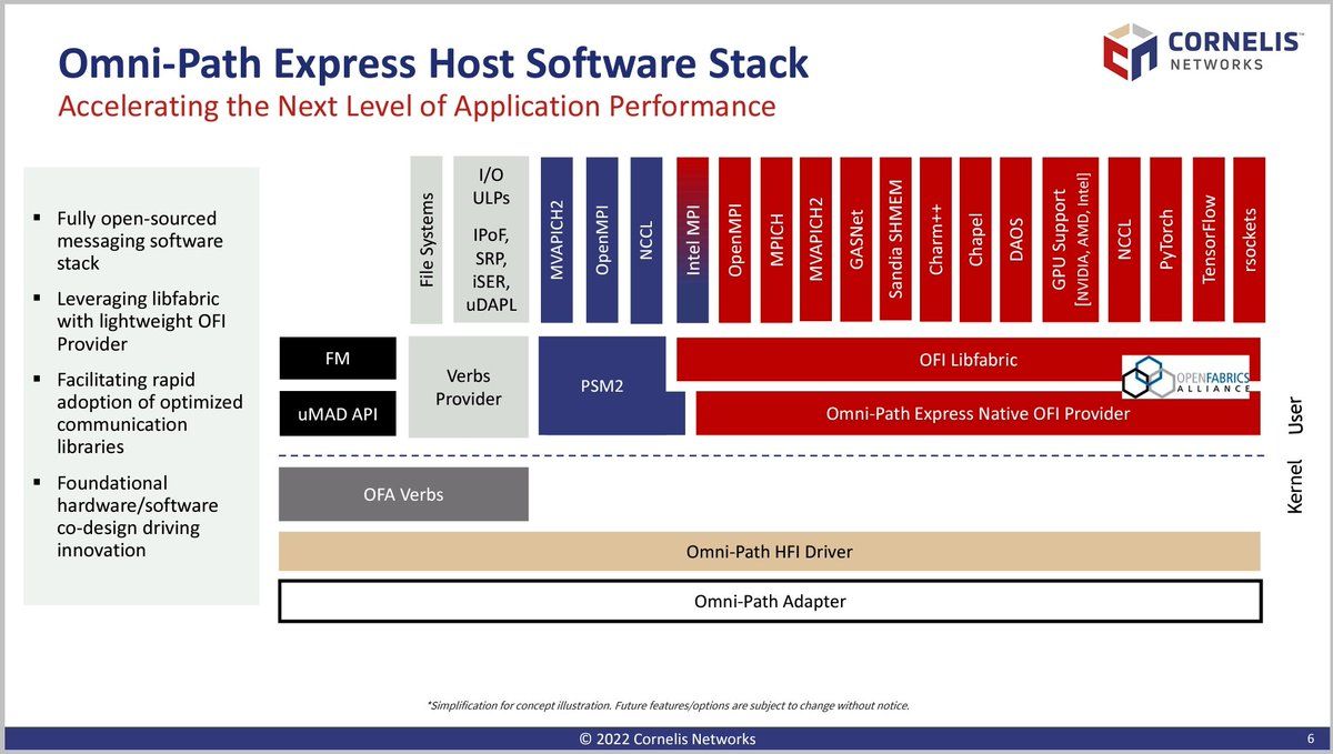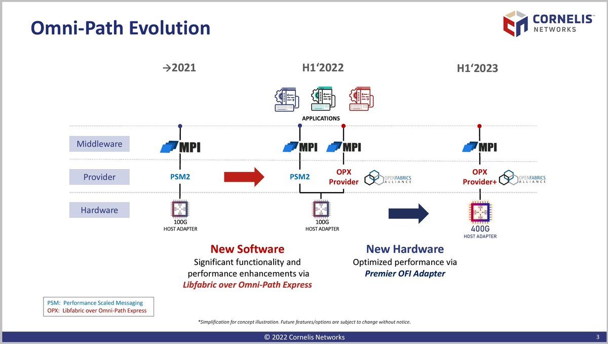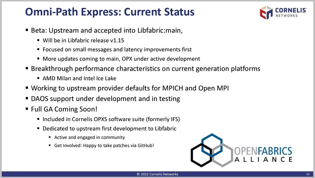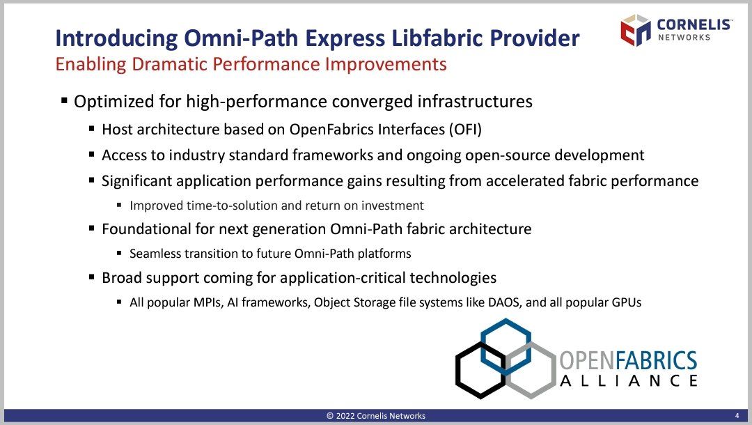 Cornelis Networks @ OFA Workshop Omni-Path Express Improved Functionality and Performance via Software Optimised for High-Performance Converged Infrastructure Based on OpenFabric Interface Foundational to next generation of NICs (400G in H1-2023)