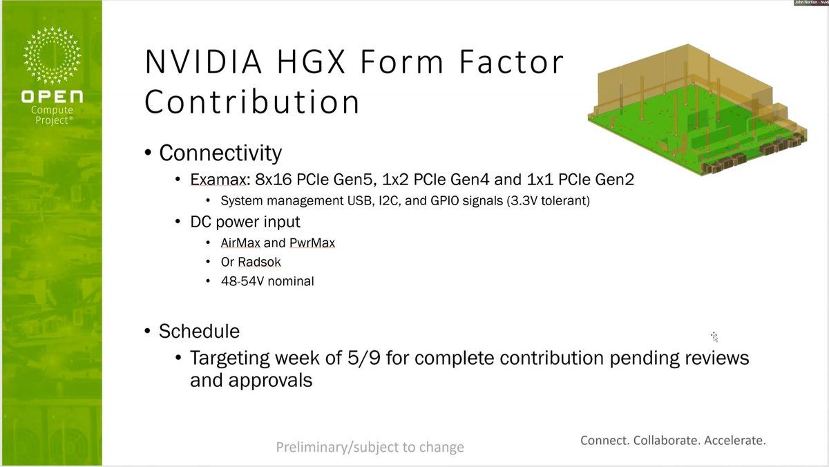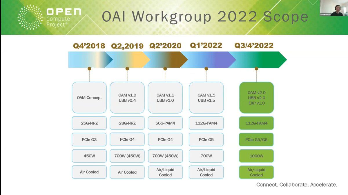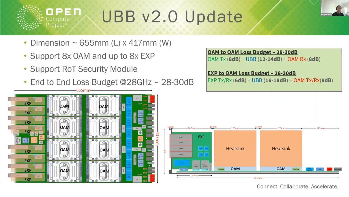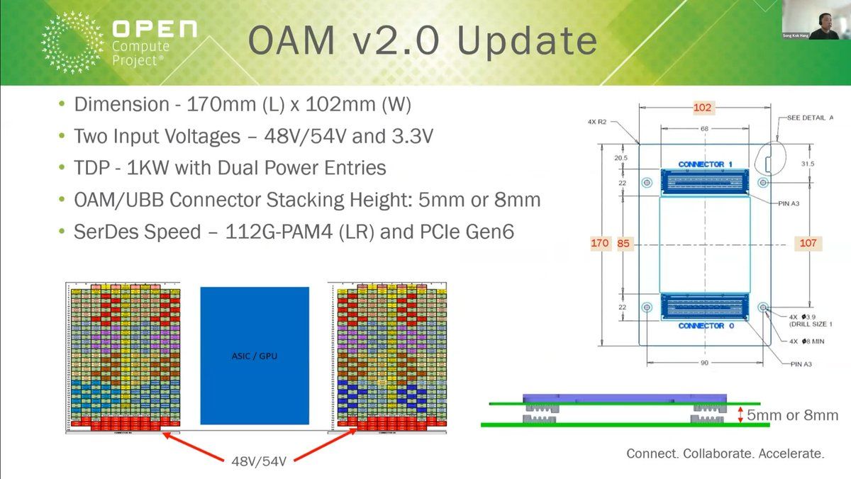 OCP Tech Talk 2022 Day 1: H2-2022 - OAM v2.0 and UBB v2.0 OAM v2.0 Size: 170 × 102 Input Voltage: 3.3V, 48/54V TDP: 1kW @Jebisabigfatmes Serdes: 112G PAM4-LR, PCIe 6.0 UBB v2.0 Size: 655 × 417 Support: 8× OAM, 8× EXP Video Link: youtu.be/jopZUWgy48U