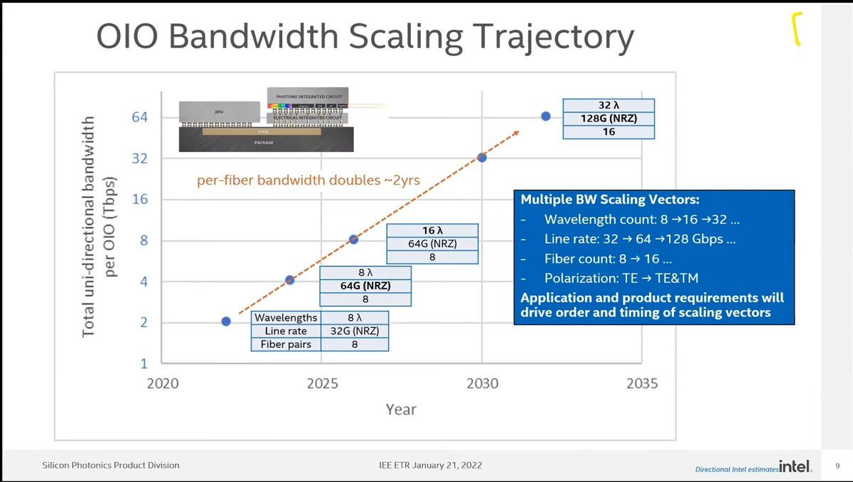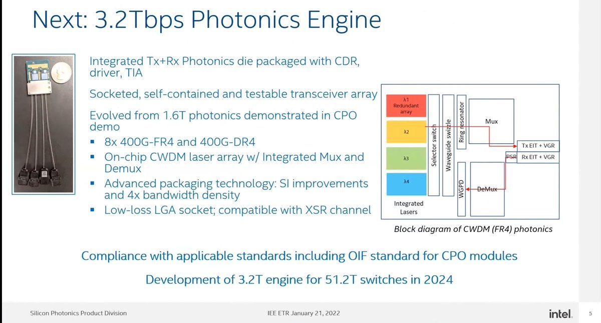 Intel Silicon Photonics Future Products/Roadmaps Intel 3.2T Photonics Engine In-development for 51.2T switches in 2024 4 Tb/s Photonics IC for Optical I/O
