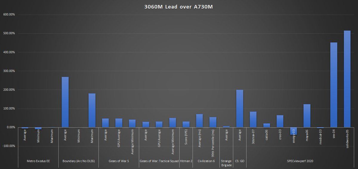 To show just how bad the A730M currently is (with the current drivers), relative to the 3060M, I've made a graph and a table with the results in the video. Note the Boundary comparison isn't fair because the 3060M is using DLSS. @9550pro/1534537010962018304